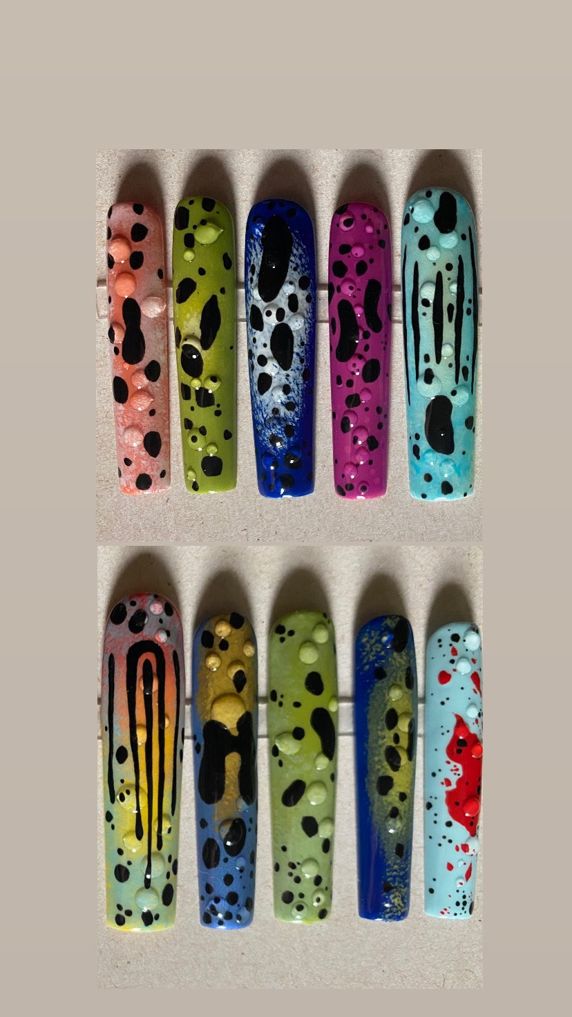 Poison dart frog inspired press on nail set! All hand painted and can be re created in any shape/length!